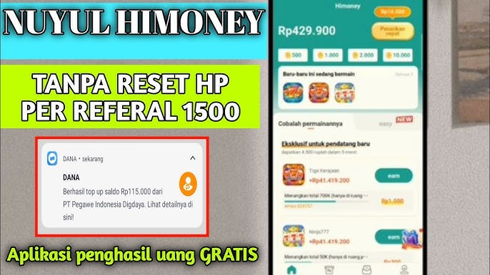 HiMoney merupakan aplikasi penghasil uang yang memungkinkan penggunanya mendapatkan uang tambahan dengan menyelesaikan tugas-tugas sederhana. Tugas yang ditawarkan dalam aplikasi ini mungkin termasuk menyelesaikan survei, menonton iklan, menggunakan aplikasi, dan aktivitas online lainnya. Setelah menyelesaikan tugas, pengguna mendapatkan reward berupa uang yang dapat ditransfer ke rekening bank atau dompet digital.
